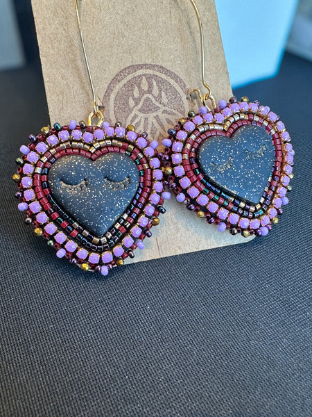 Cinnamon Hearts are made with clay centers surrounded by delica beads in shades of burgundy, pink, black and black, and purple metal rhinestone banding. Backed with light brown leather, earring hook in high-quality stainless steel.